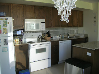 The living/dining room and kitchen. Open concept living definitely worked for me here! The green patterned curtains in the dining area are the last set that I made. The glass drop chandelier is a combination of a chandelier bought from The Home Depot, and a drum shade Benita got for me from the Umbra sale. The glass tile backsplash shimmers in the light.