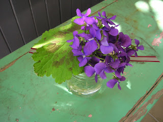 An arrangement of violets with a pretty leaf that was used at my first market day.
