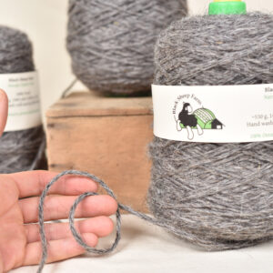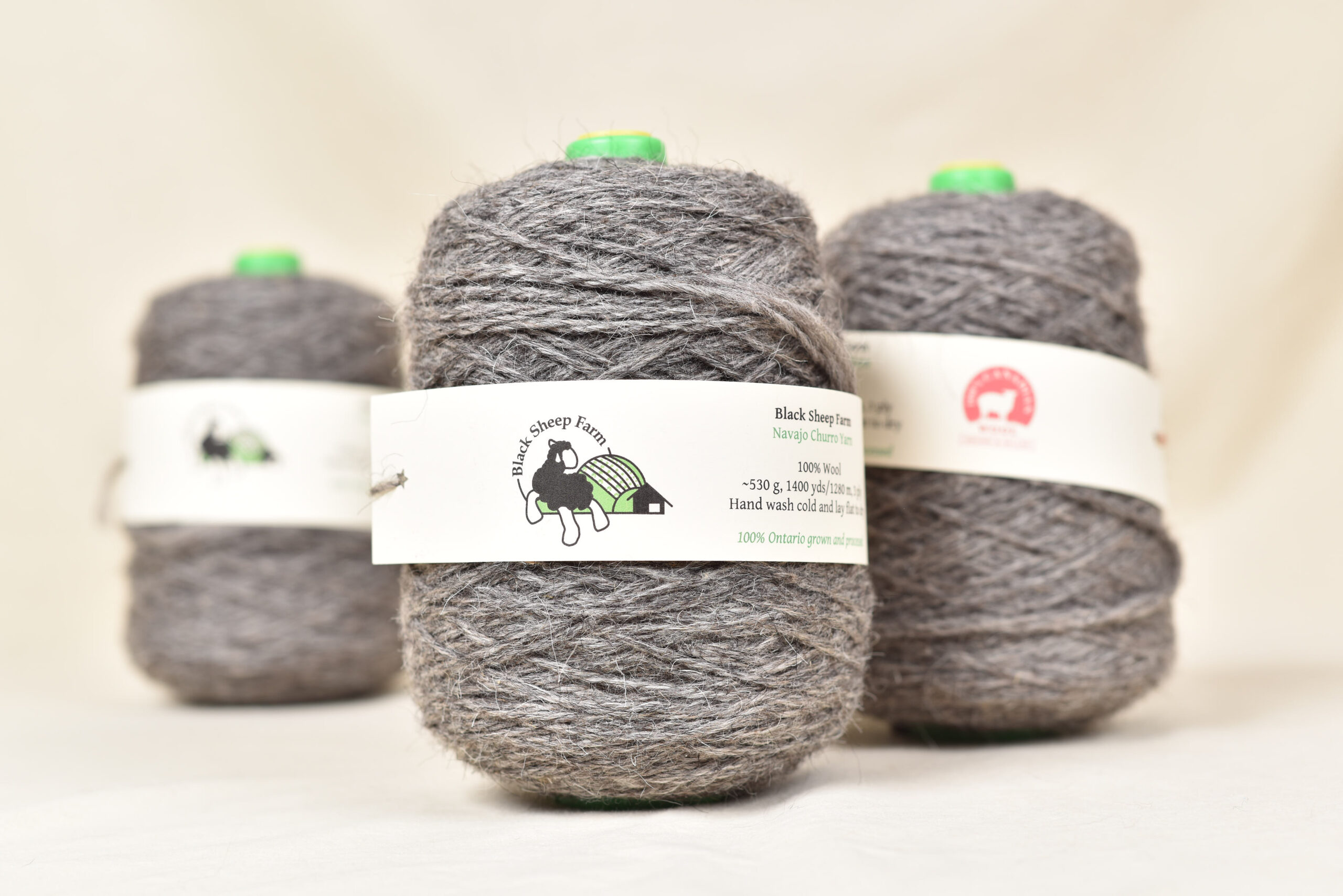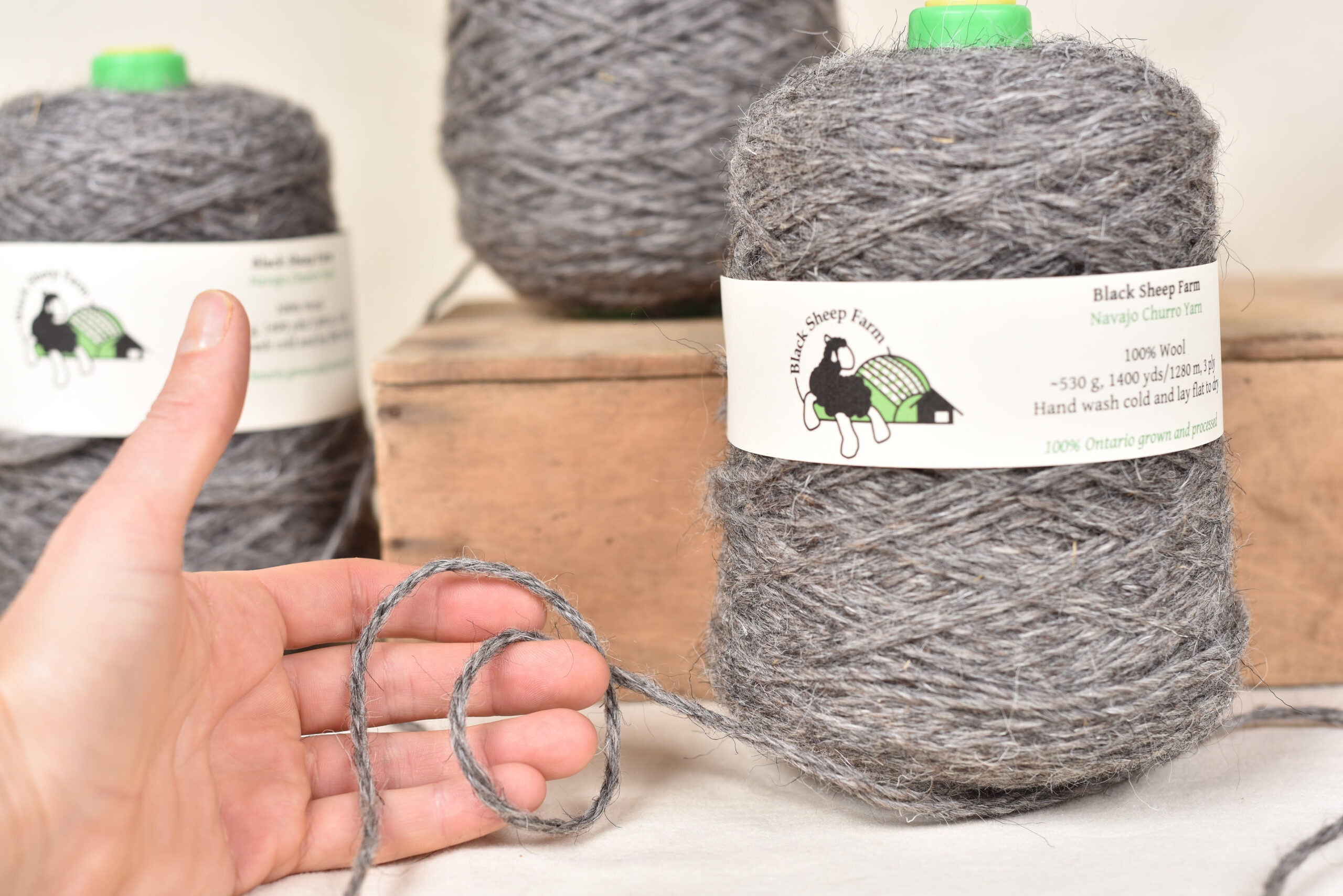 This yarn was made exclusively from the fleeces of our Navajo Churro ewes, spun by Wave Fibre Mill in Parry Sound. The yarn is a bulky 3-ply, 1200 YPP. These cones weigh about 530 g with 1,400 yards/1,280 metres of yarn. It is extremely strong and can definitely be used for warp.