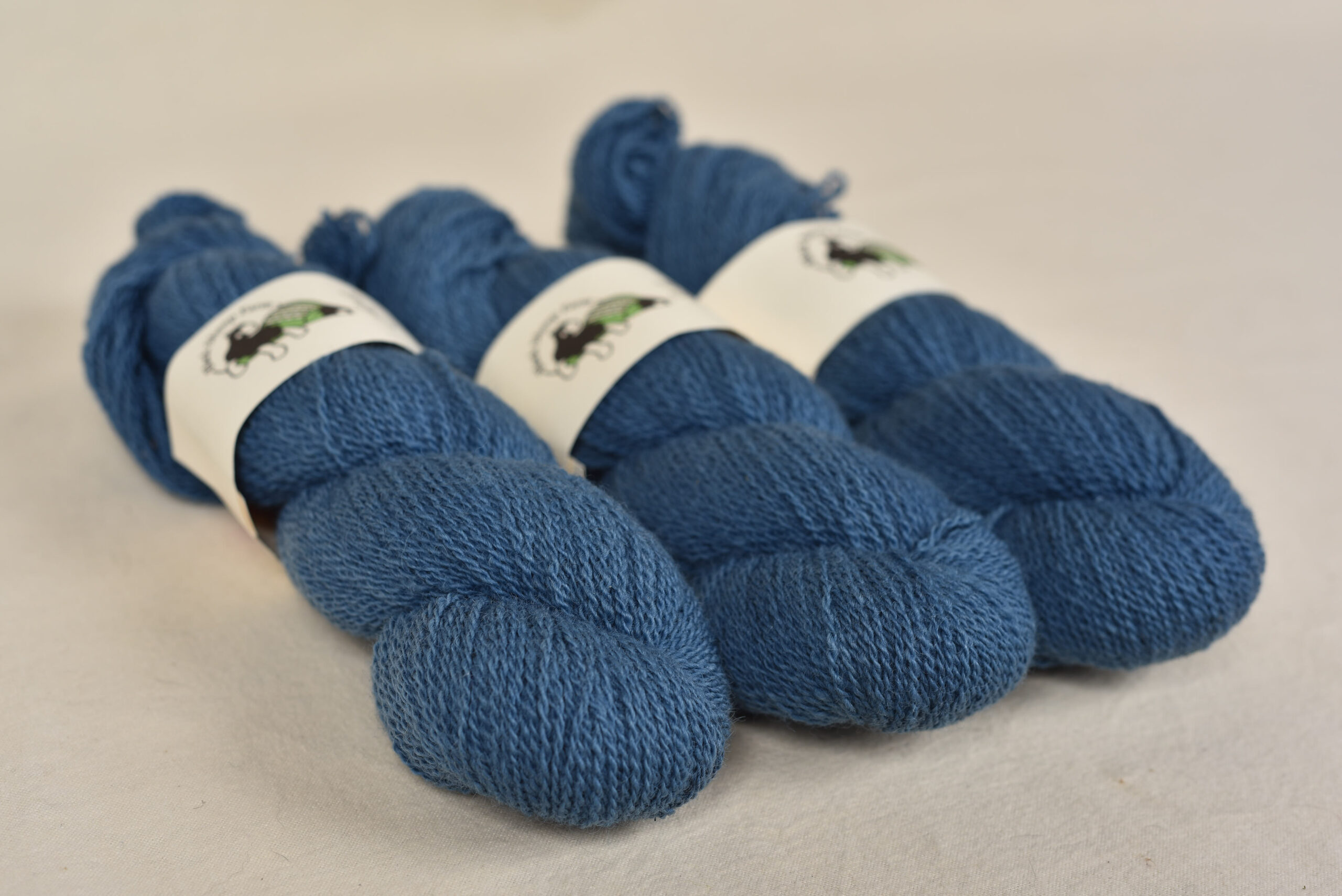 It was botanically dyed on the white Sola yarn base, by Brittany Piper of Everwilde with Indigo, producing a medium denim blue colour. As it has been dyed on the white Sola yarn base, it can be combined easily in a project with the white, Black-eyed Susan yellow-green, and Hopi Black Dye Sunflower grey/green colours. Perfect for stripes, colour blocks or Fair Isle colourwork.